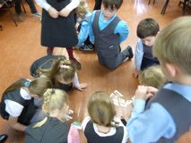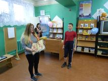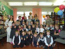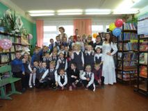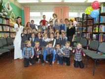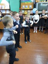 Первоклассники со сказочными героями: Королевой Книгой (Голубева Алина), Буратиной(Носкова Ксения), Гришкой Скворцовым(Дьячков Виталий) и Грязной Книжкой (Рупосова Елизавета) рисовали портрет Буратино, отгадывали загадки, играли и танцевали.